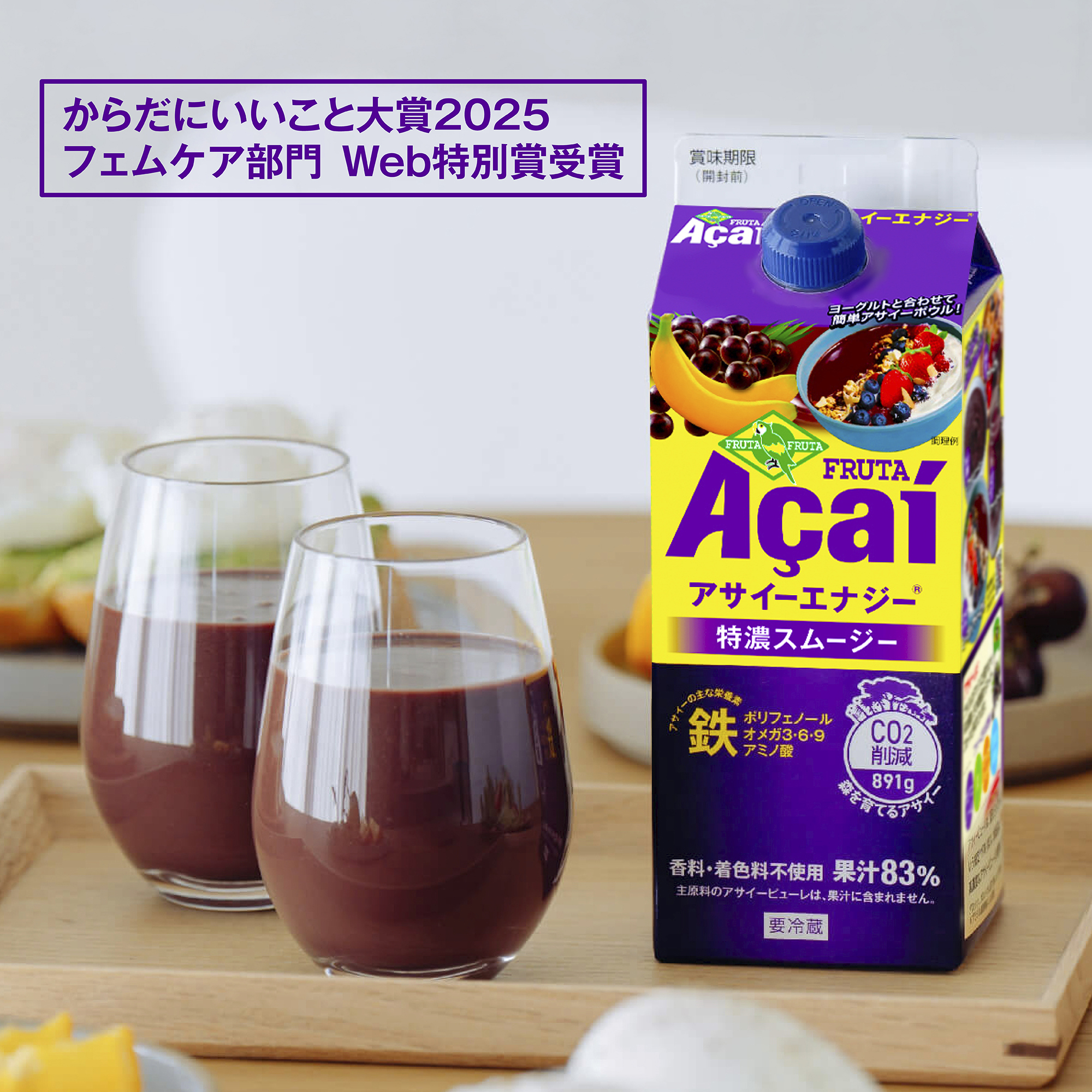 「アサイーエナジー」は、フルッタフルッタのジュースバー「フレッシュジュースバー」から誕生した発売当時からの人気NO.1商品です。2006年の発売から少しずつ改良を重ね、進化を遂げています。アサイーの果肉に含まれる主な栄養素